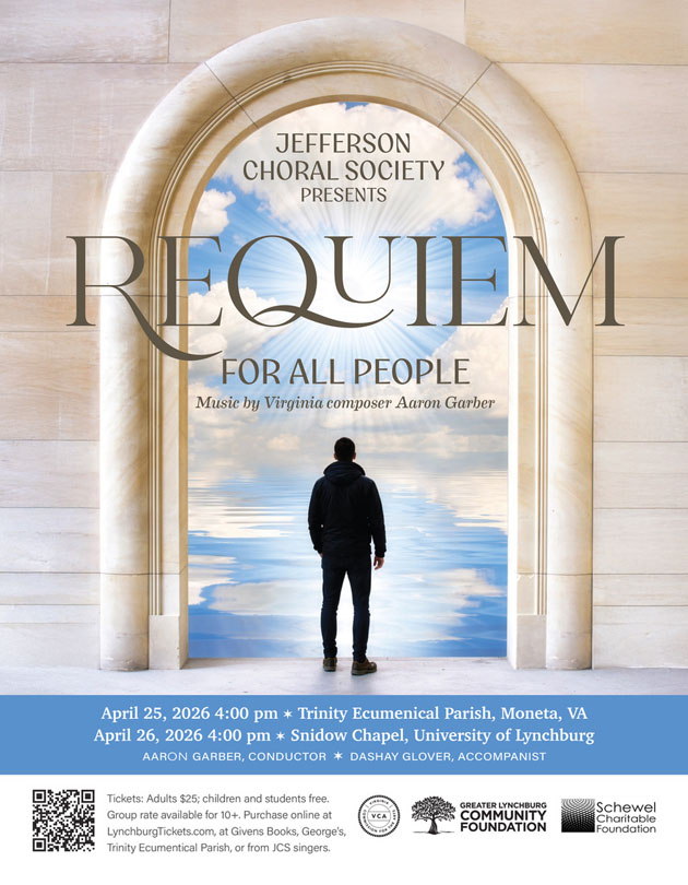 Celebrated Virginia composer Aaron Garber directs the Jefferson Choral Society in two performances of his newest composition, Requiem for All People, on Sat., Apr. 25, at 4:00pm at Trinity Ecumenical Parish in Moneta or Sun., Apr. 26, also at 4:00pm at Snidow Chapel on the campus of the University of Lynchburg.